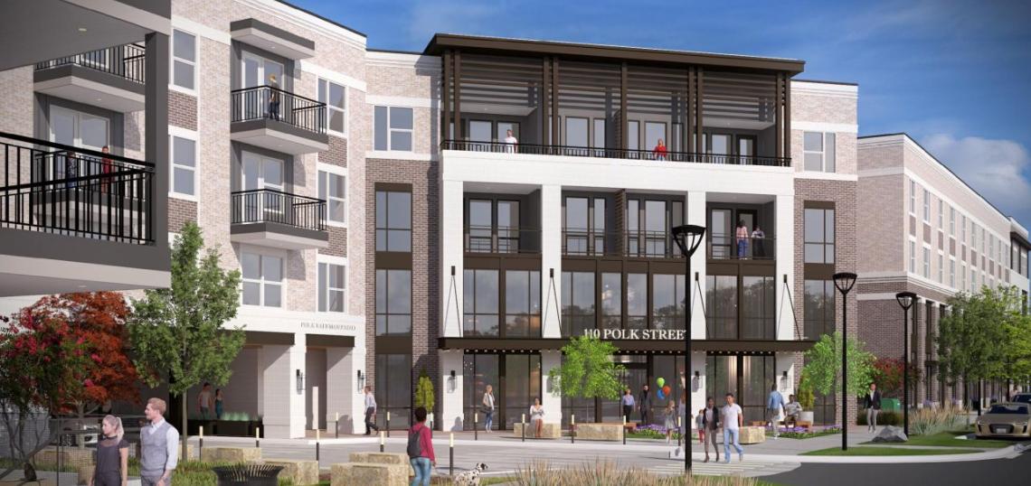 The project, a joint venture with Tokyu Land Corporation, will rise from a three-acre site at 110 E. Polk Street, replacing two existing buildings and a parking lot. Plans call for a new four-story building complex including 281 studio, one-, and two-bedroom apartments ranging from 590 to 1,340 square feet in size. Plans also call for a amenities such as a fitness center, a swimming pool, and co-working space.